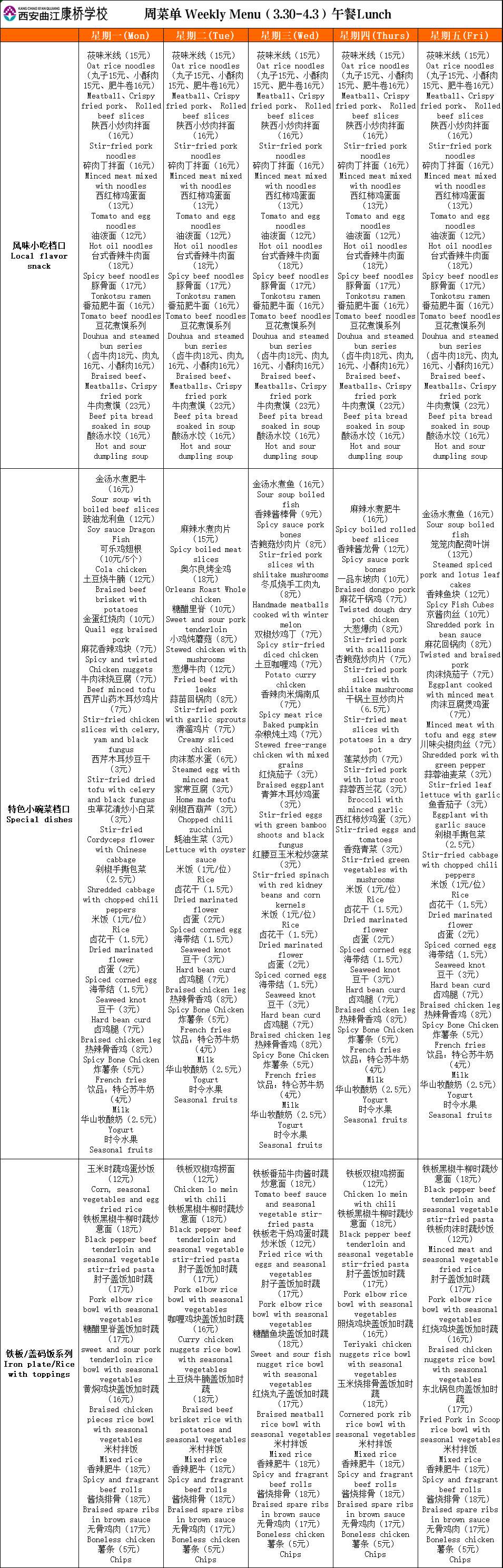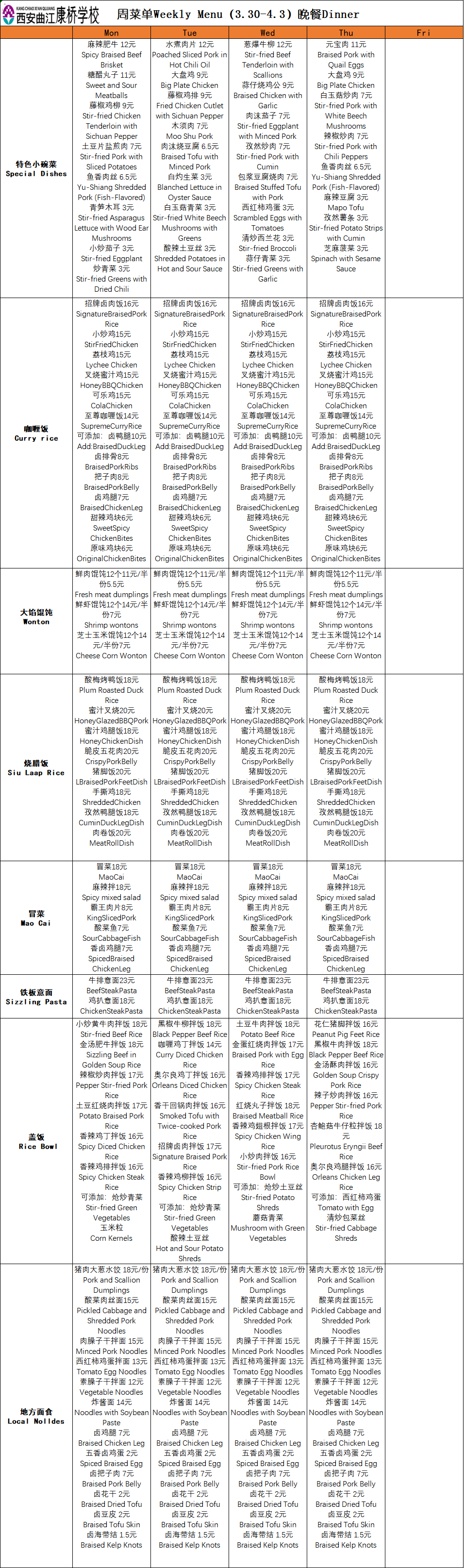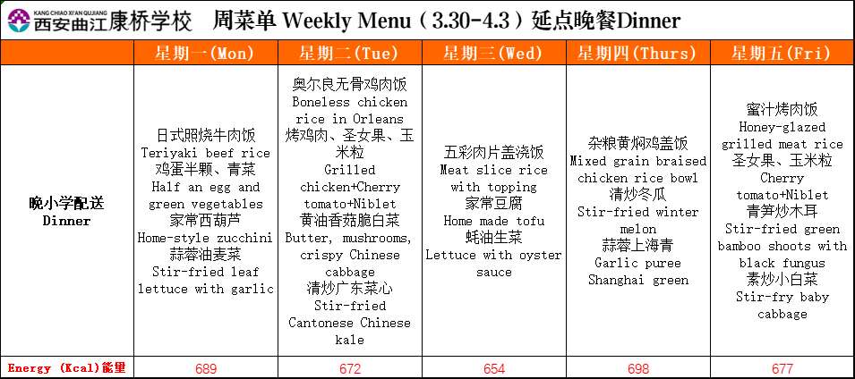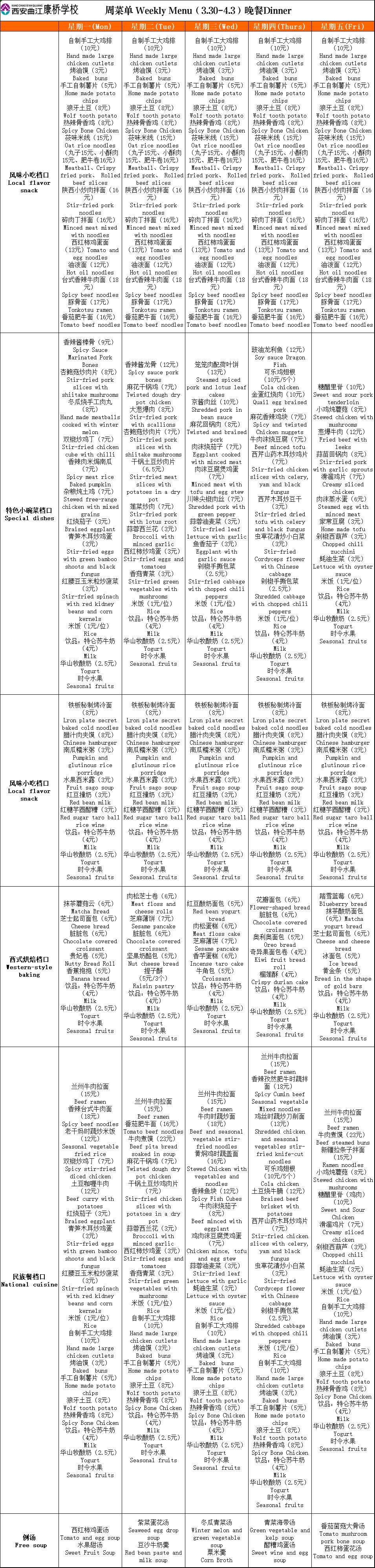二餐厅周菜单(3.30-4.3)