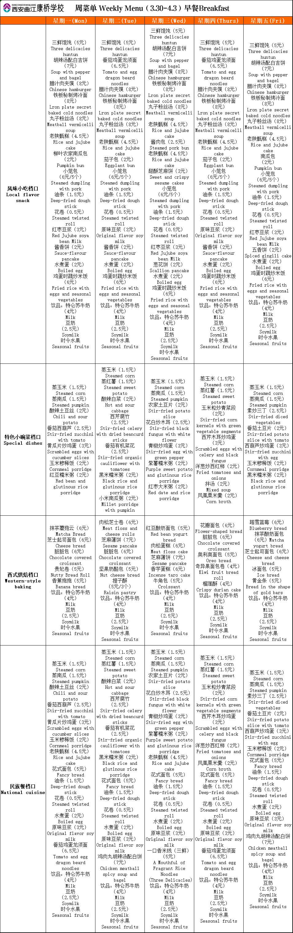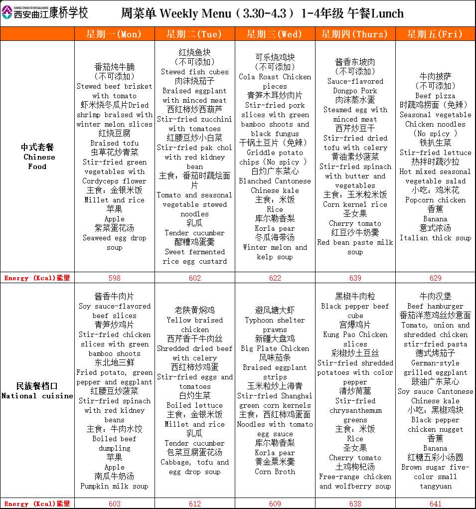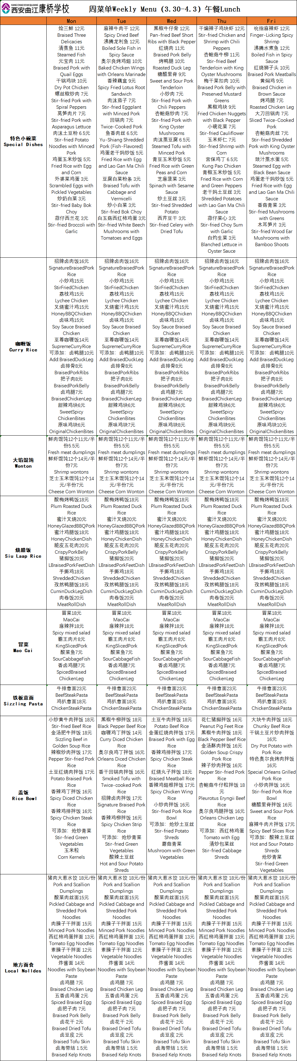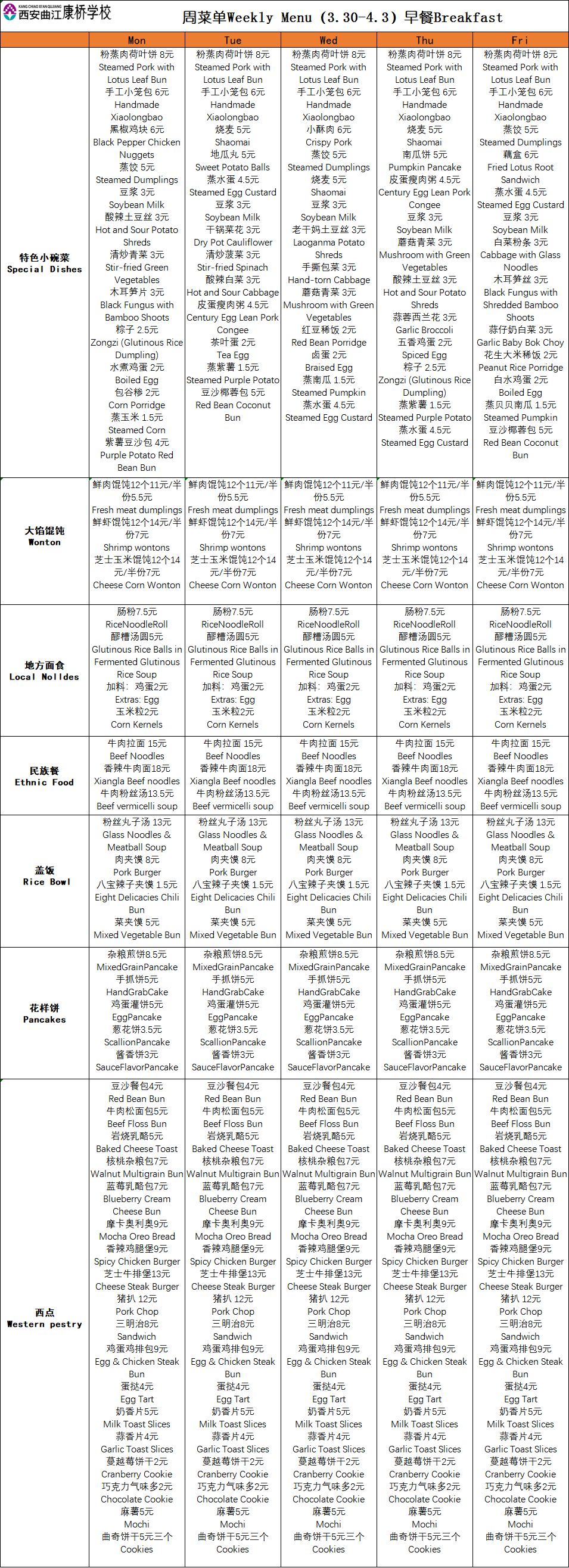 二餐厅周菜单(3.30-4.3)