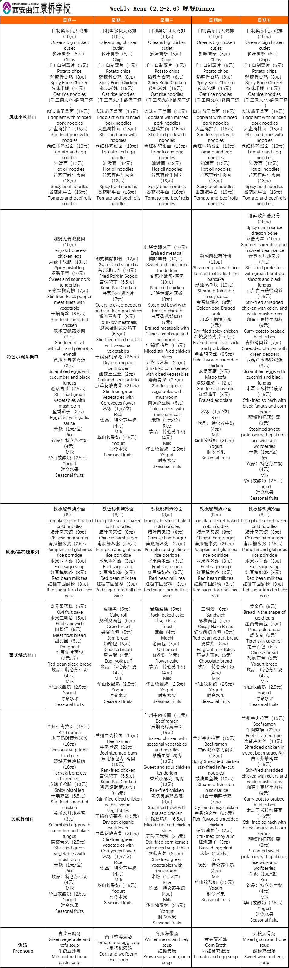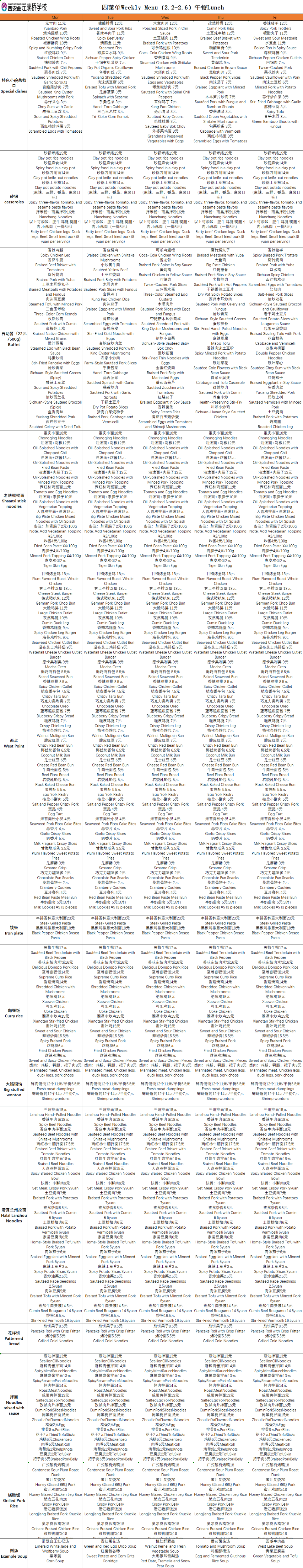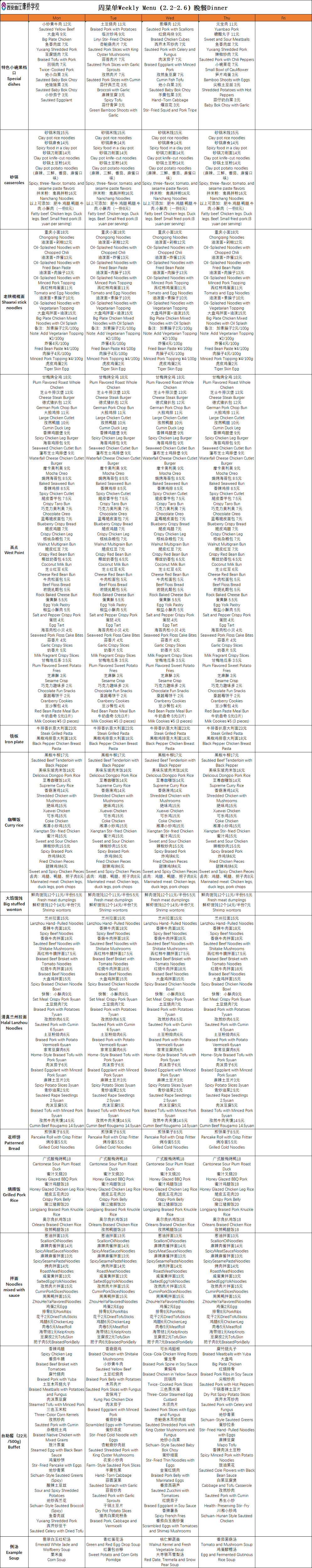 二餐厅周菜单(2.2-2.6)