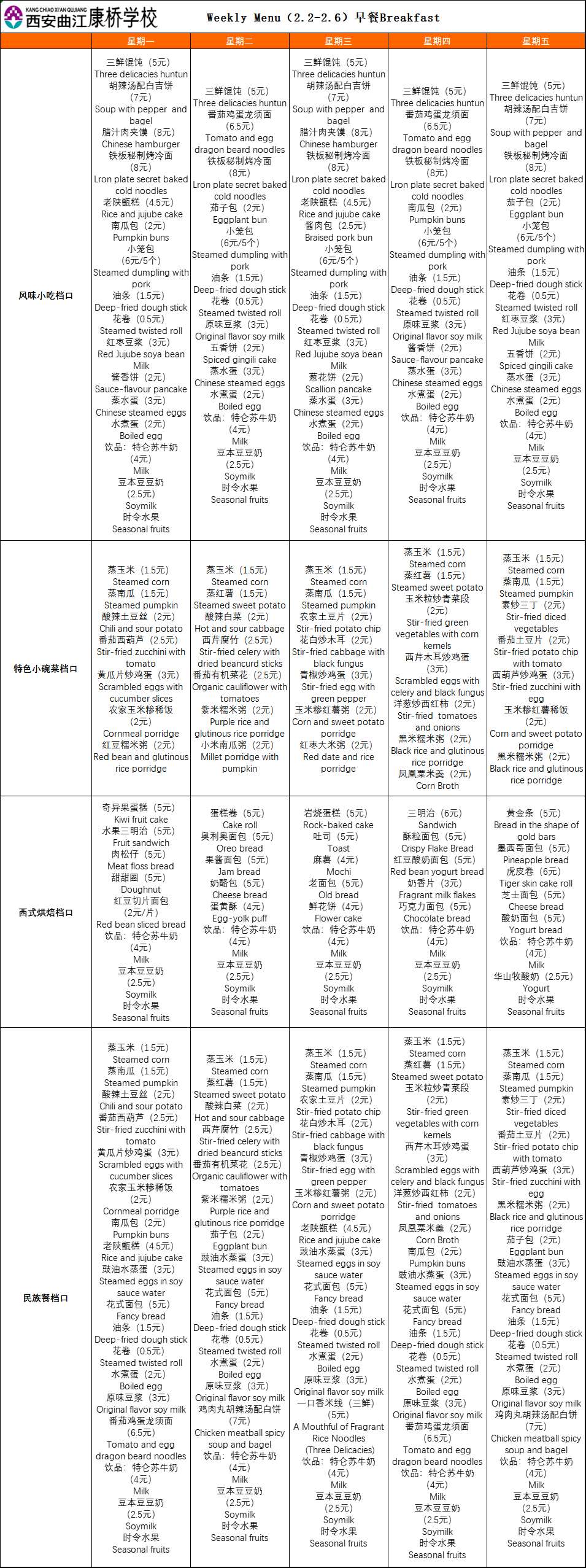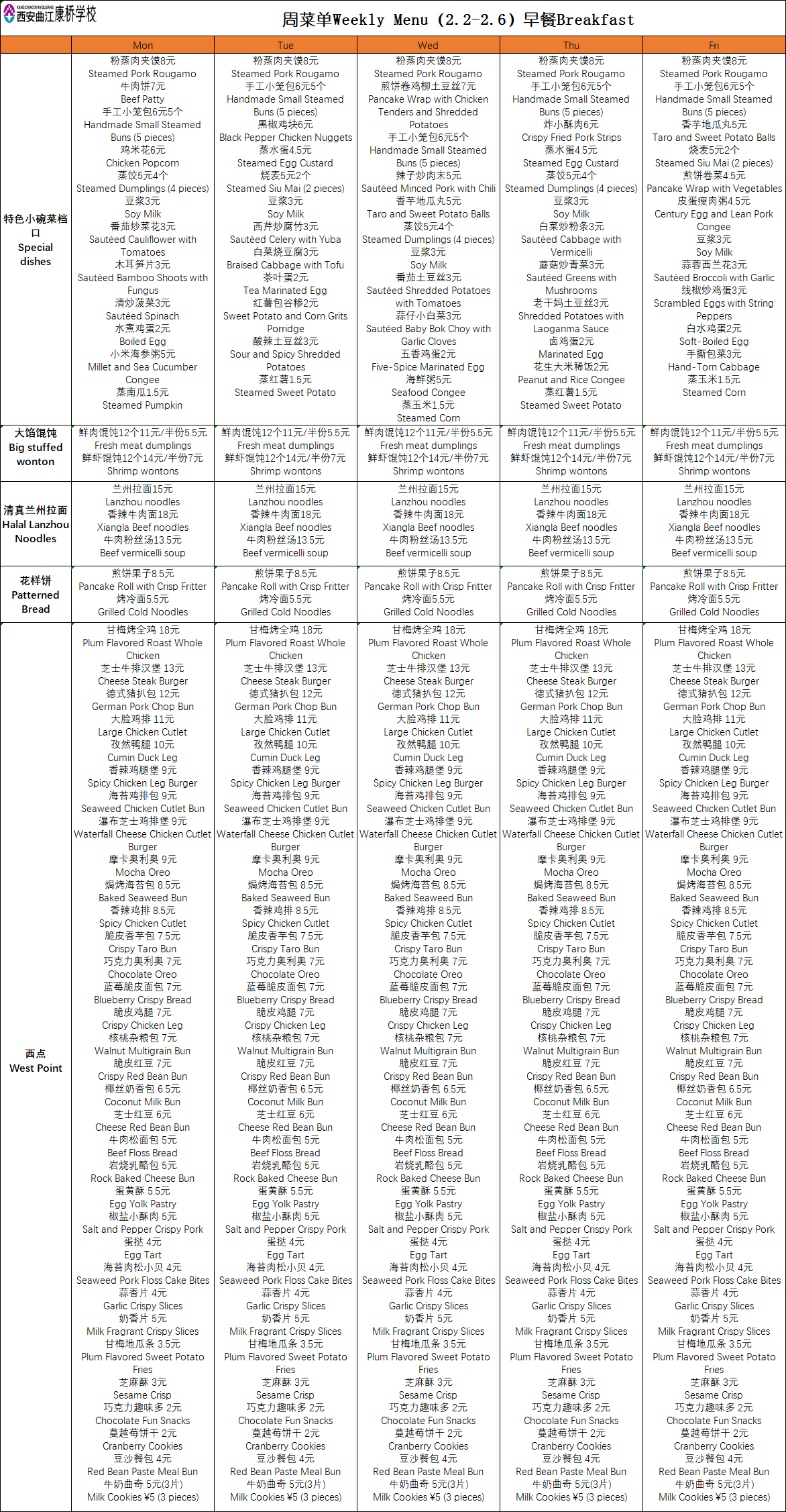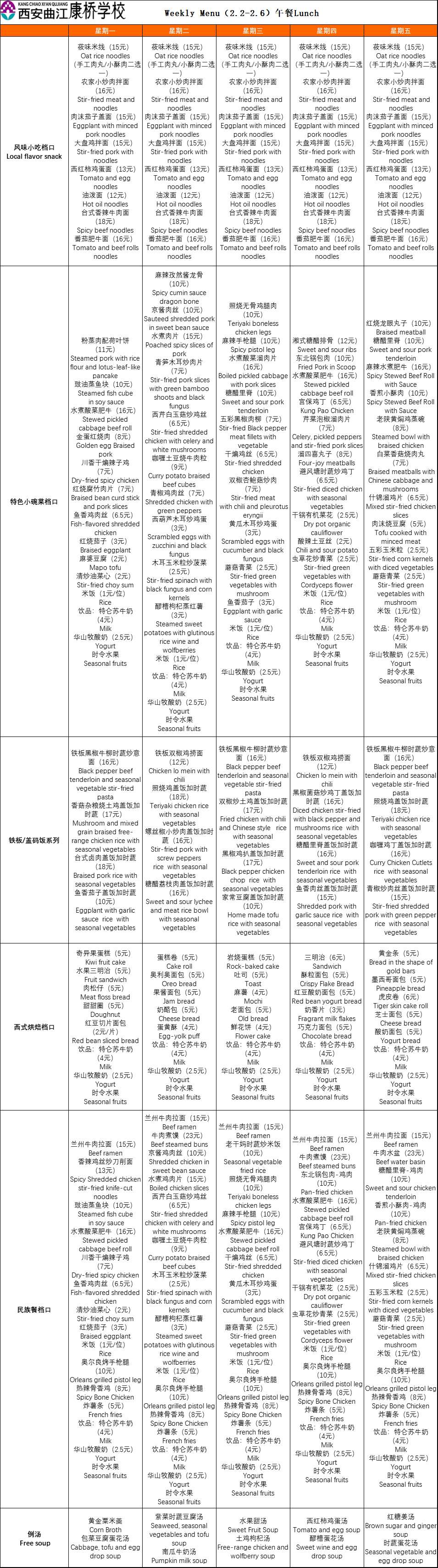 二餐厅周菜单(2.2-2.6)