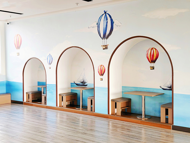 *热气球故事区:以放松阅读为核心,采用热气球主题造型,玩偶娃娃墙的专注陪伴,学生可席地而坐,在沉浸式氛围中享受阅读乐趣;